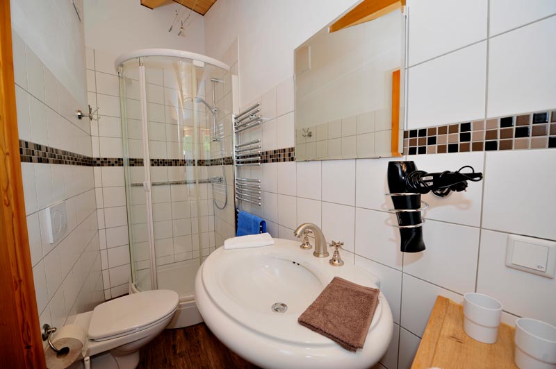 • Badezimmer mit Duschkabine, Waschbecken, WC, Föhn