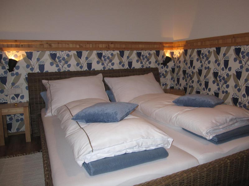 Dieses Zimmer befindet sich im 1. Stock in der Werkstatt der ehemaligen Tenne. Es hat ein eigenes Badezimmer mit Duschkabine, großes Waschbecken und Toilette und eine wunderschöne Aussicht! Das Doppelbett, die Farbwahl und Wand-Dekorierung kreieren eine englische Atmosphäre.
