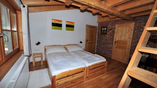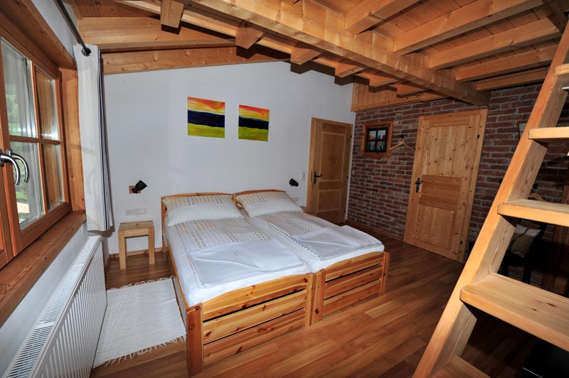 Dieses Zimmer befindet sich im ersten Stock auf dem ehemaligen Heuschuppen. Es hat ein eigenes Badezimmer mit separater Duschecke, großes Waschbecken und Toilette. Unter dem Dach von großen diagonalen Balken “hängt” ein Schlafboden welche mit einer stabilen Treppe zu besteigen ist. Vor allem Kinder lieben diese ‚cooler‘ Schlafplatz. Es ist ein sicherer Schlafplatz für 2 Kinder. Unten befinden sich 2 Einzelbetten die auch zusammenschoben werden können. Detailgetreu ist dieses Zimmer mit alten Mauerziegelwänden und einem ‘Tulpen Stall-Fenster’ versehen.