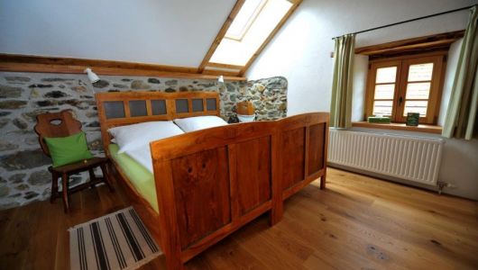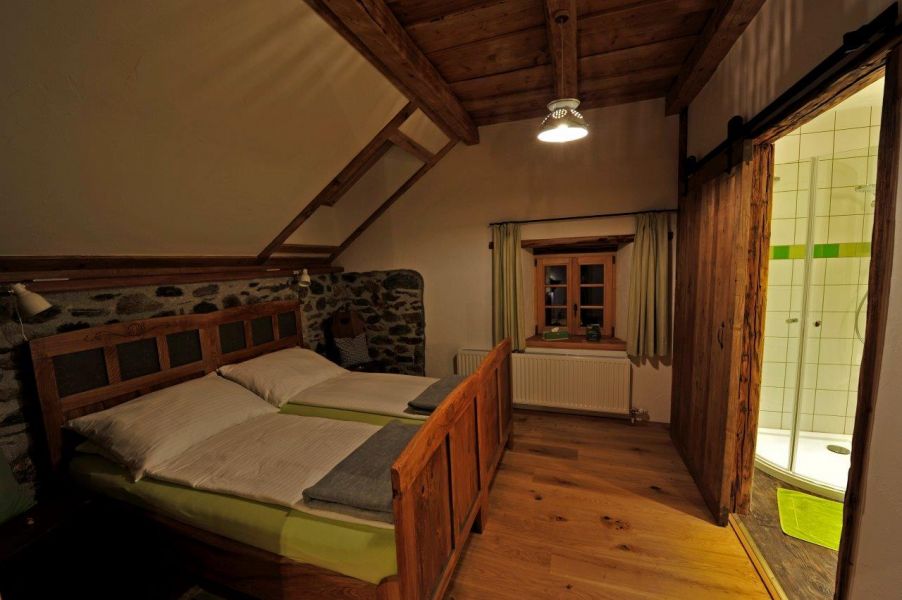 Sehr geräumiges Doppelzimmer mit einem Doppelbett mit separaten Matratzen. Das helle (mit extra Dachfenster), im Bauernstil eingerichteten Zimmer hat ein Badezimmer mit Dusche, Waschbecken und WC.
